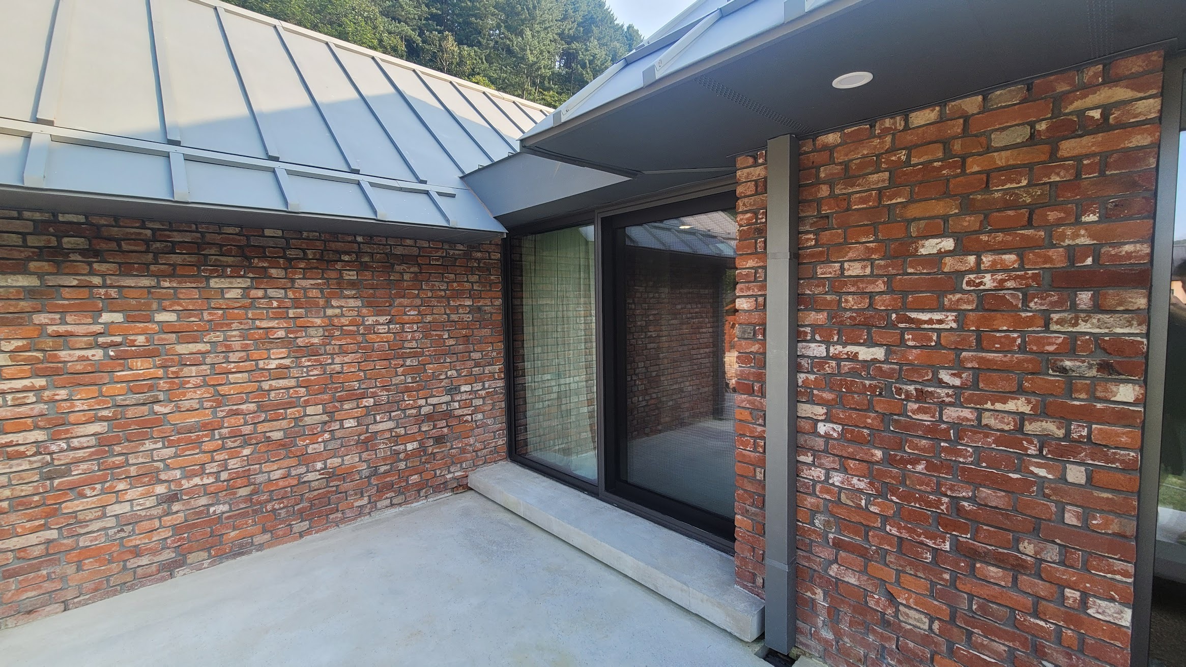 그런 의미로 옛날 창고 건축에서 흔히 볼 수 있는 붉은 고벽돌로 외장을 마감했다. 고벽돌이 주는 묵직한 존재감은 시간이 흐를수록 더 깊이 있는 표정을 만들어낼 것이다. 그리고 그 위를 덮는 삼각형의 지붕에는 티타늄 징크를 적용하여 시간이 지나며 자연스럽게 변색되는 금속의 표면의 미묘한 변화도 이 집의 일부가 되는 것이 원하는 의도였다.