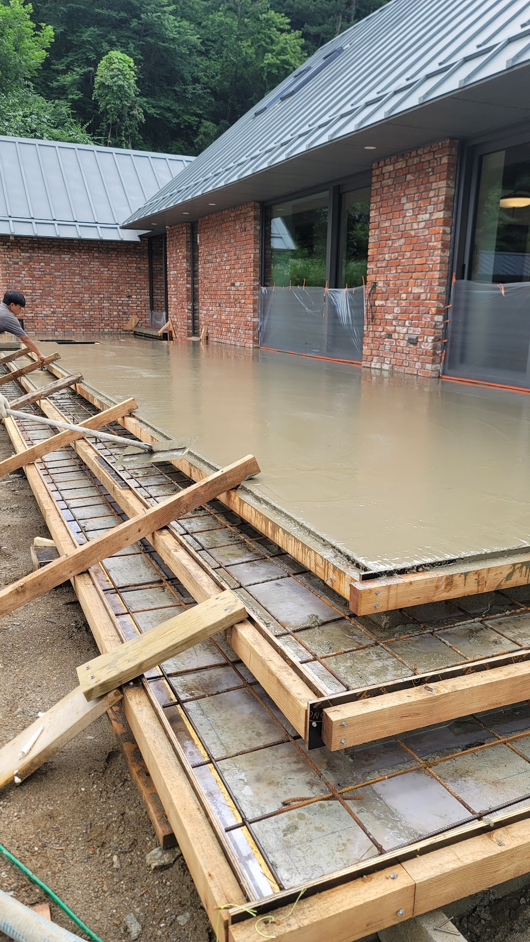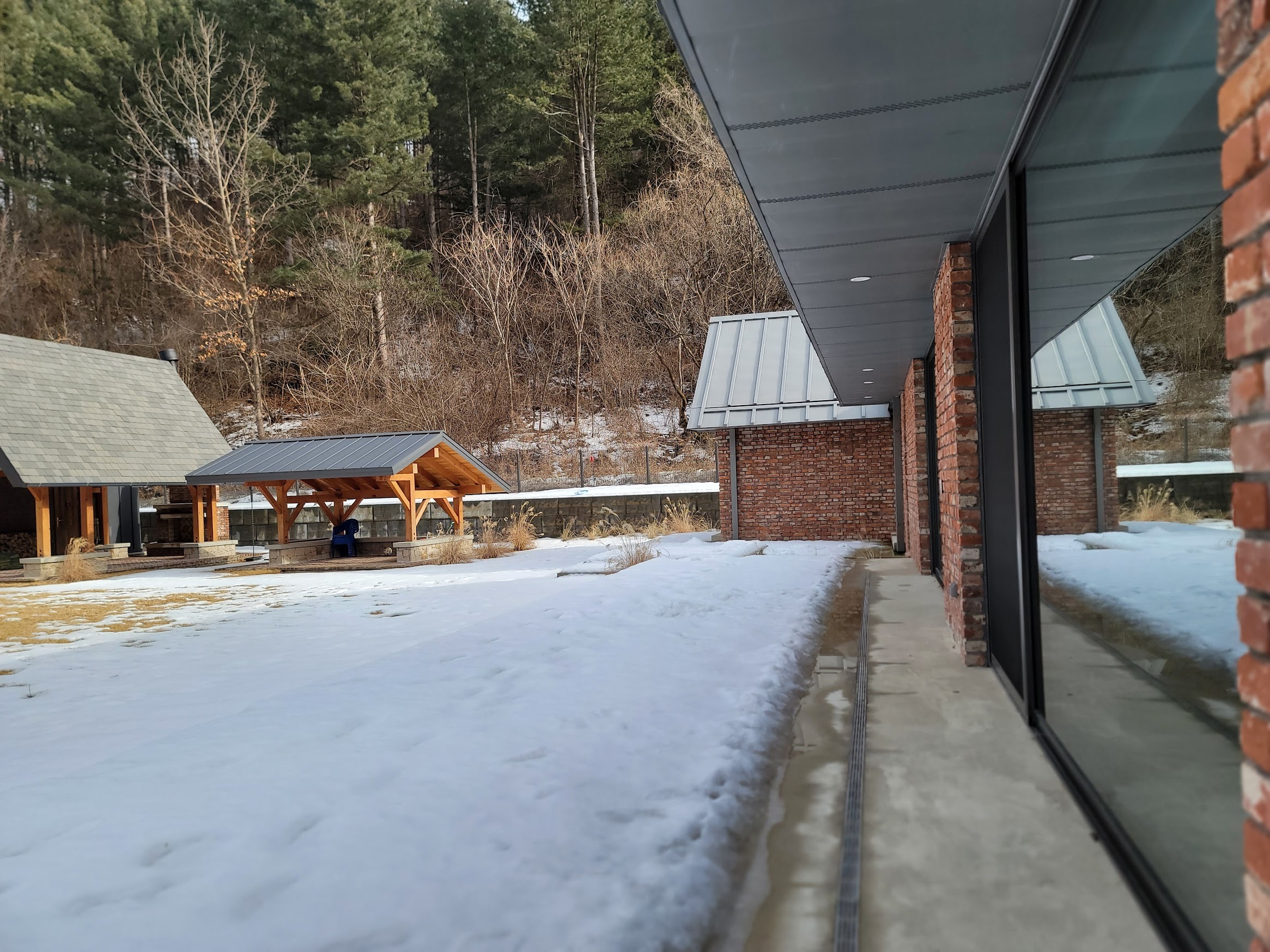 본동은 티타늄 징크, 게스트하우스는 천연 돌기와로 마감했다.  본동의 티타늄 징크는 일반적인 거멀접기가 아닌 각재심기로 하였는 데 시공 전 시공팀과 한달은 시방 디테일로 티격태격 한 것 같다. 왜 이렇게 안되는 것이 많은지... 게다가 겨울 공사여서 시공팀이 많이 고생한 기억이 난다.