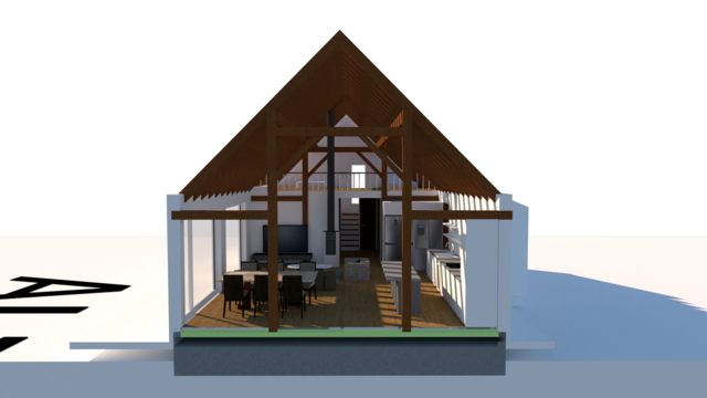 이 프레임은 3가지 목구조 방식이 혼용된 하이브리드 양식이다. 외벽라인은 2*6 Wall로 구성하고, 내부에 고주 4개를 세워 Mid Span Plate ( 중도리) 를 만들고 외벽플레이트를 도리 삼아 서까래를 얹고 서까래 끼리는 장부로 연결한다. 종보에서 서까래가 서로 엊깔리게 얹어지는 방식의 전통한옥과는 차이가 있다. 정서상 감정적으로 생경하게 느끼는 부분이다.
