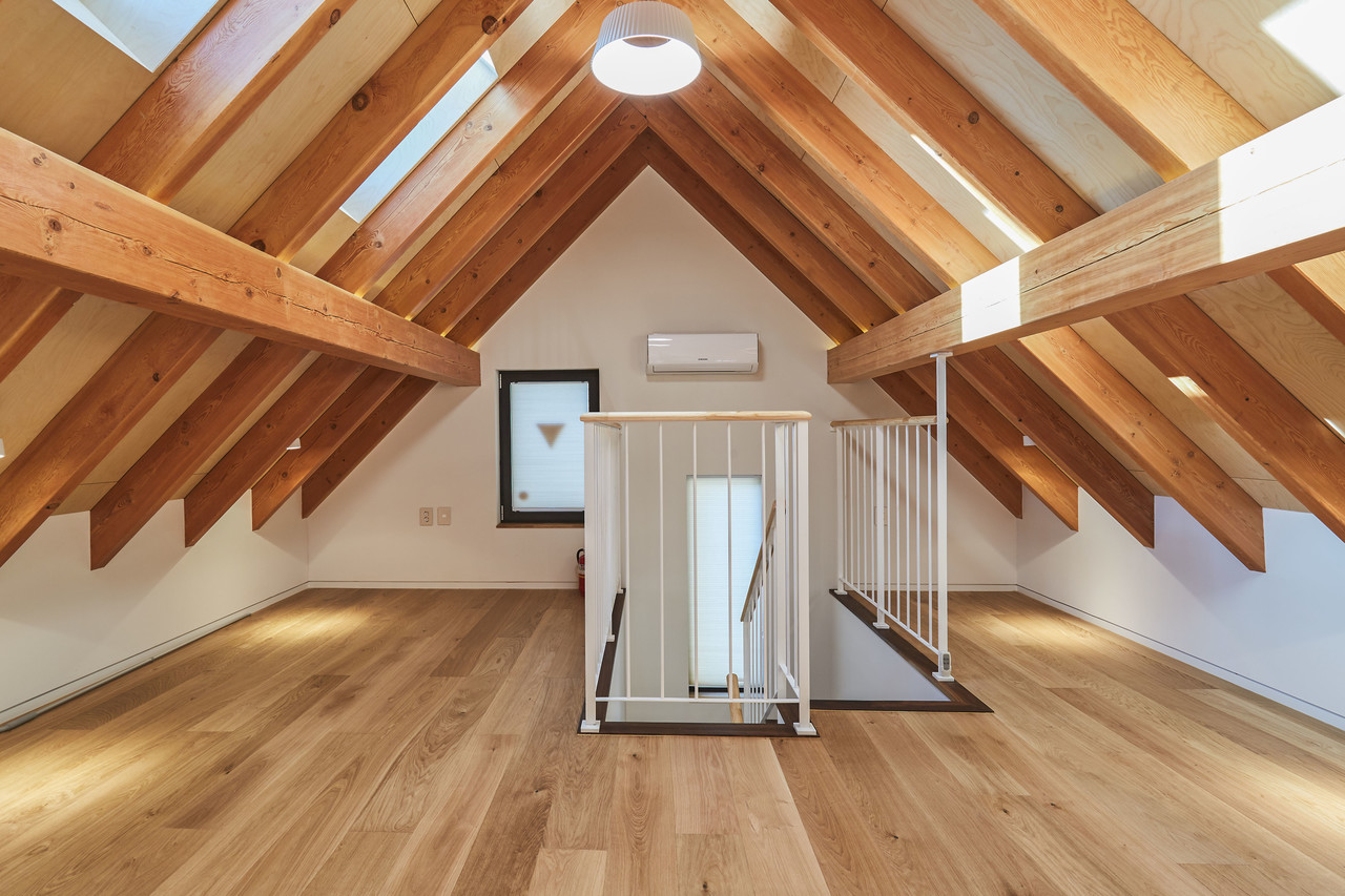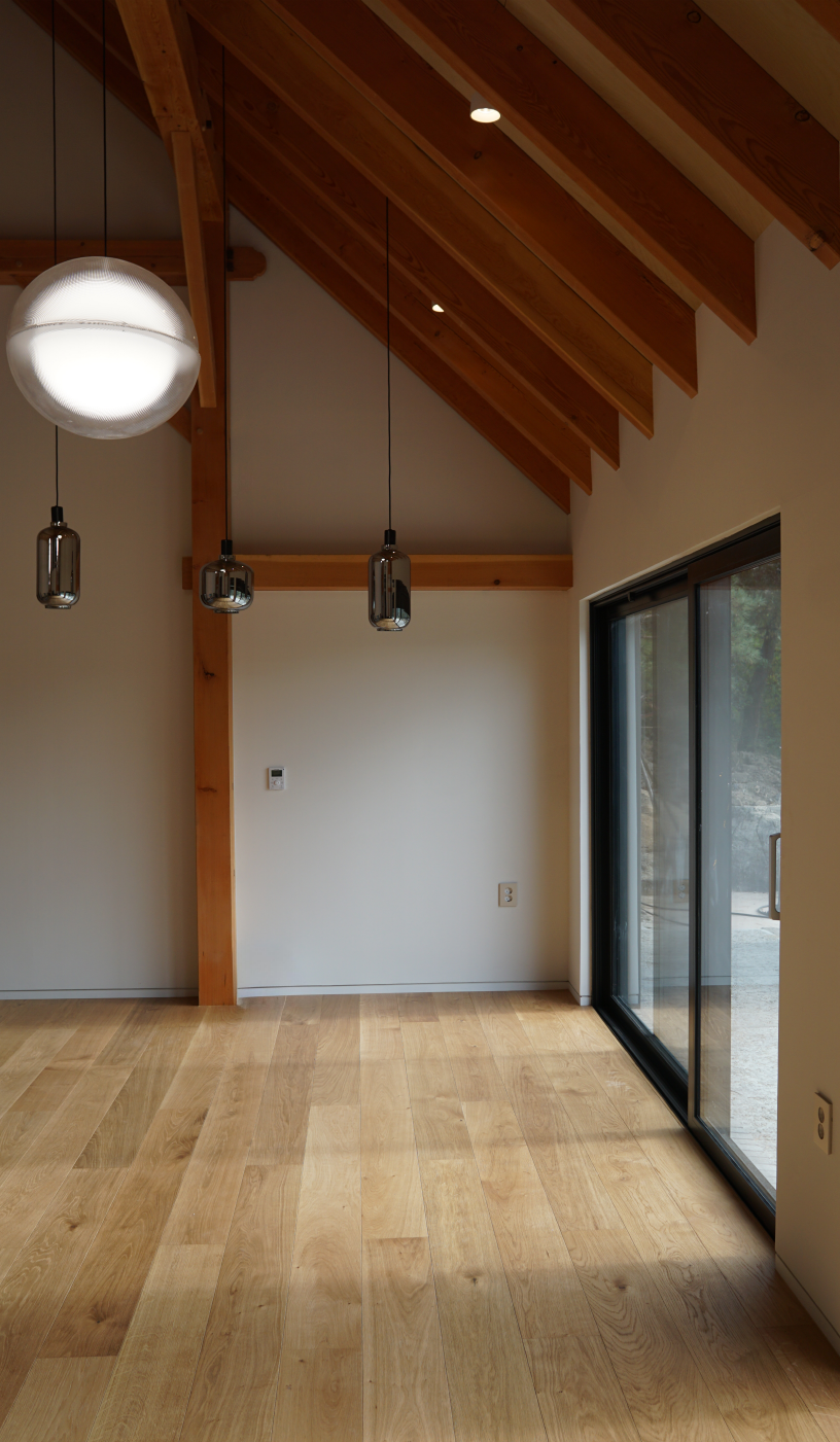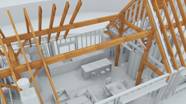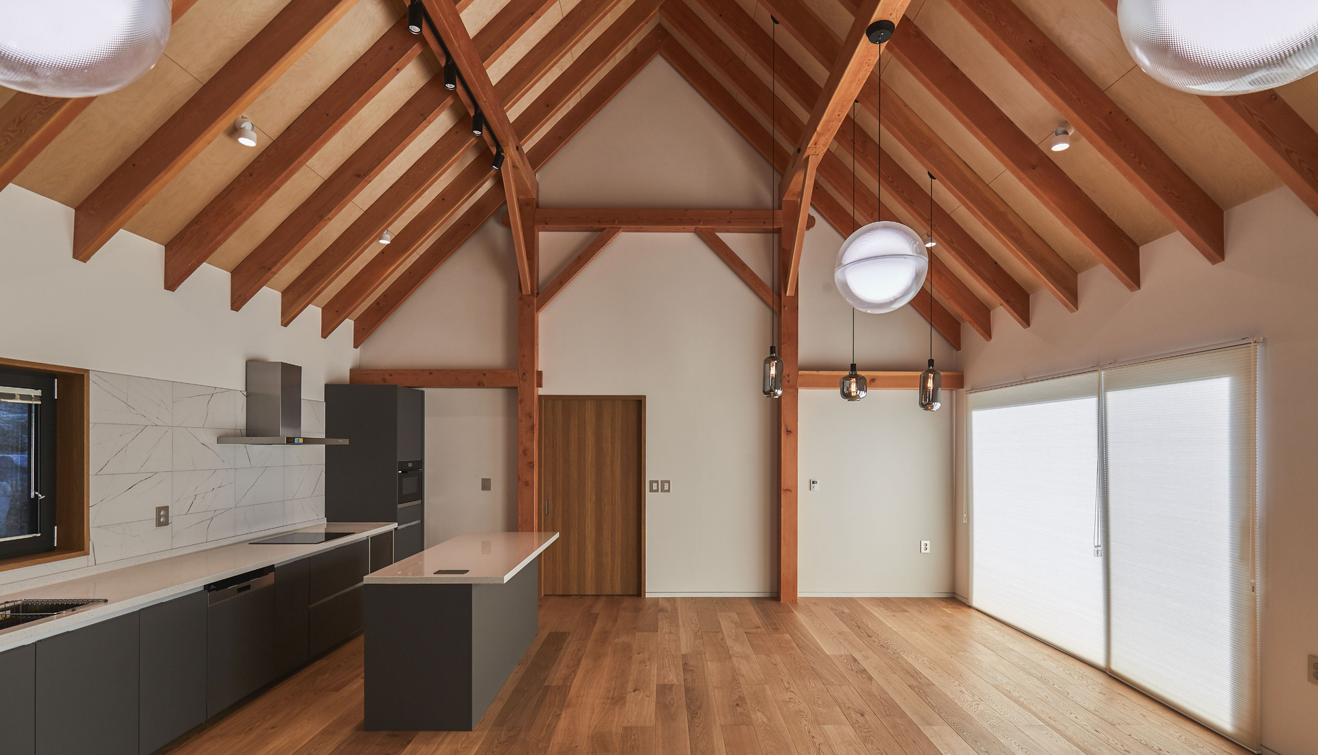네 개의 고주와 중도리가 만드는 중심 공간이 전체의 균형을 잡고, 좌우 베이(Bay)는 각각의 용도에 맞게 배치되었다. 한 쌍의 굵은 플레이트가 지붕 공간을 가득 채우며, 중앙 베이는 하이브리드 구조임에도 불구하고 온전한 팀버프레임의 구조미로 인식된다. 이 프로젝트는 팀버프레임의 구조적 아름다움을 명확히 드러내고자 한 의도에서 출발했다. 수년 만에 다시 시도한 하이브리드 방식이었고, 경량목구조와의 결합은 이번이 처음이었다. 우려도 있었지만, 결과는 기대 이상으로 만족스럽다.