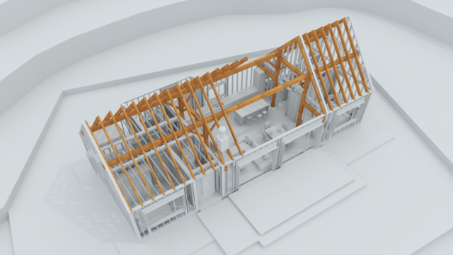 즉 수직 지지체계를 기반으로 한 축조 방식이다. 이 방식은 전통 한옥의 구조와 큰 차이가 없다. 결국 모든 축부재가 놓이고 마지막에 서까래가 놓이는 구조이며, 팀버프레임에서 서까래 방식이 펄린 방식보다 정서적으로 더 친숙하게 느껴지는 이유 역시 전통 한옥 양식에서 비롯된 구조적 기억 때문일 것이다.