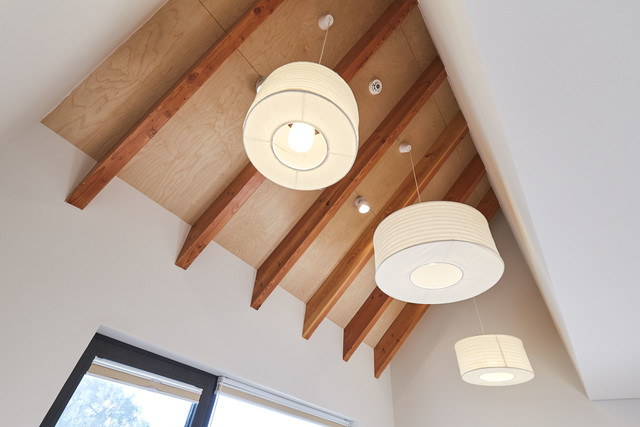 이번 프레임의 또 다른 특징은 팀버프레임과 경량목구조, 그리고 SIP 3가지 목구조의 하이브리드 인데 경량목구조는 팀버프레임에서 분화한 구조이며 SIP는 경량목구조에서 분화한 구조이다, 따라서 전체적으로는 같은 체계로 구성이나 시공성이나 큰 이질감은 없다. 오히려 기둥과 플레이트 라인을 명확히 정리할 수 있다는 점에서 디자인적으로는 장점이 있다. 간결한 마감을 통해 보다 모던한 공간 표현이 가능하다.