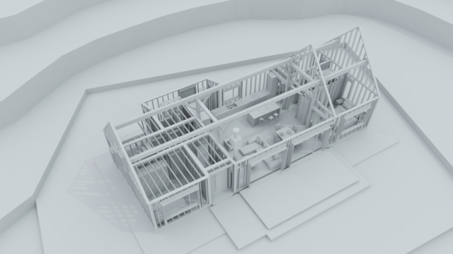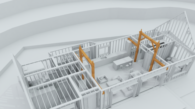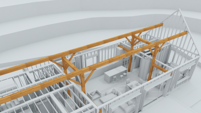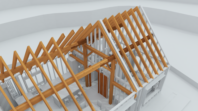 팀버프레이머의 설계는 평면에서 시작하지 않는다. 입면을 얘기하는 것이 아니고 당초부터 평면과 함께 3D 프레임 모델을 염두에 둔다. 자유로운 평면에서 출발 하지 못하는 것은 일면 핸디캡이다. 평면보다 3D 프레임을 먼저 고민하는 방식은, 건물을 '가두는 벽'이 아니라 '지탱하는 뼈대'로 이해하는 팀버프레이머만의 정체성이다. 하지만 최종적으로 완성된 공간이 3차원 공간이 된다는 것으로 보면 완성도 면에서 궂이 핸디캡으로 보고 싶지 않다.
