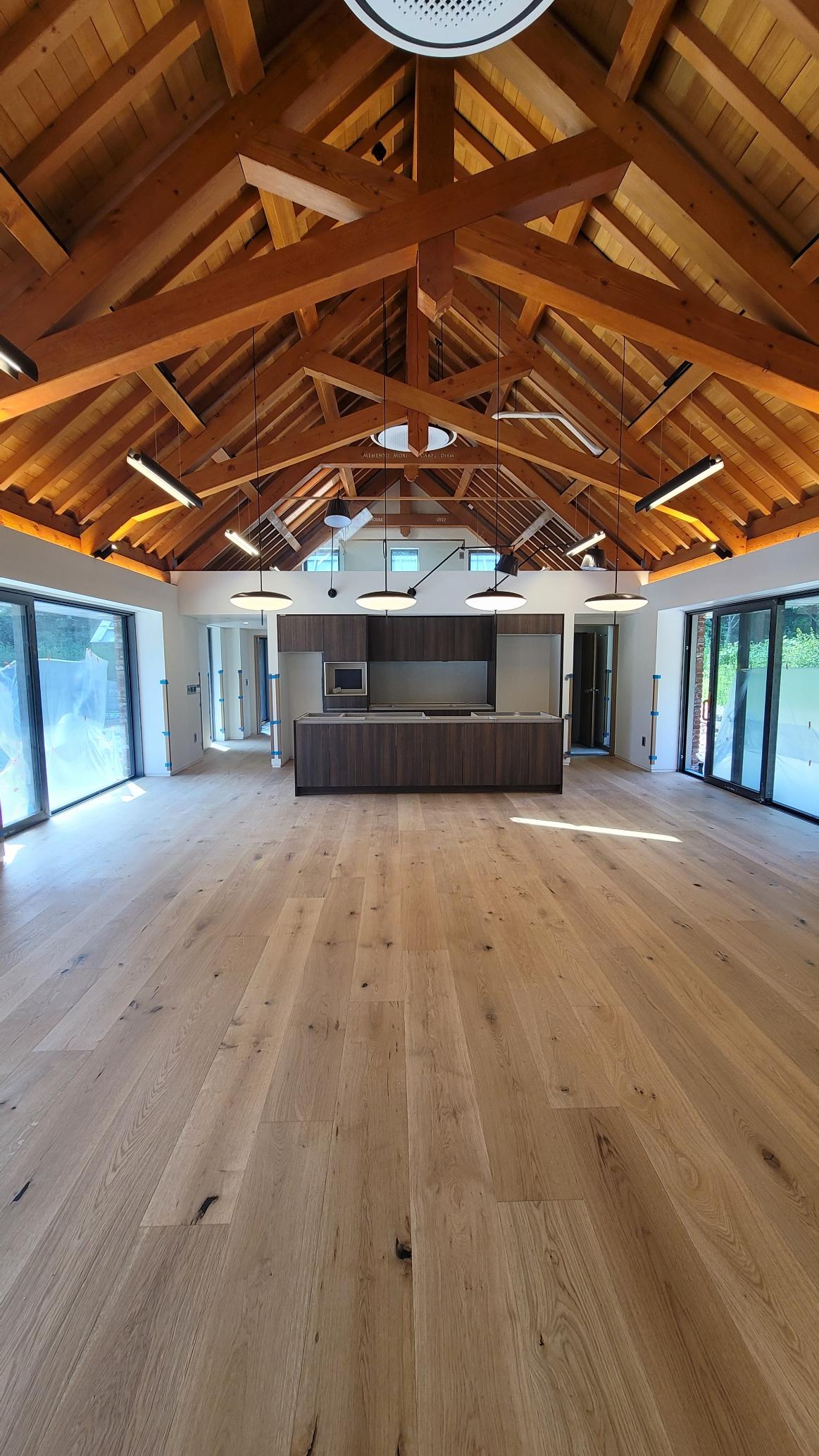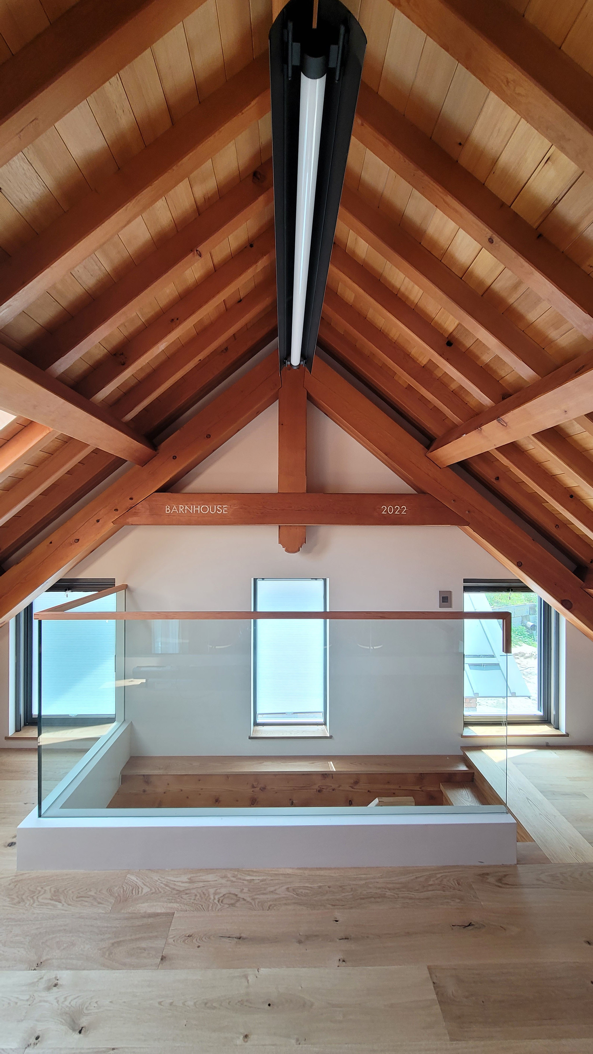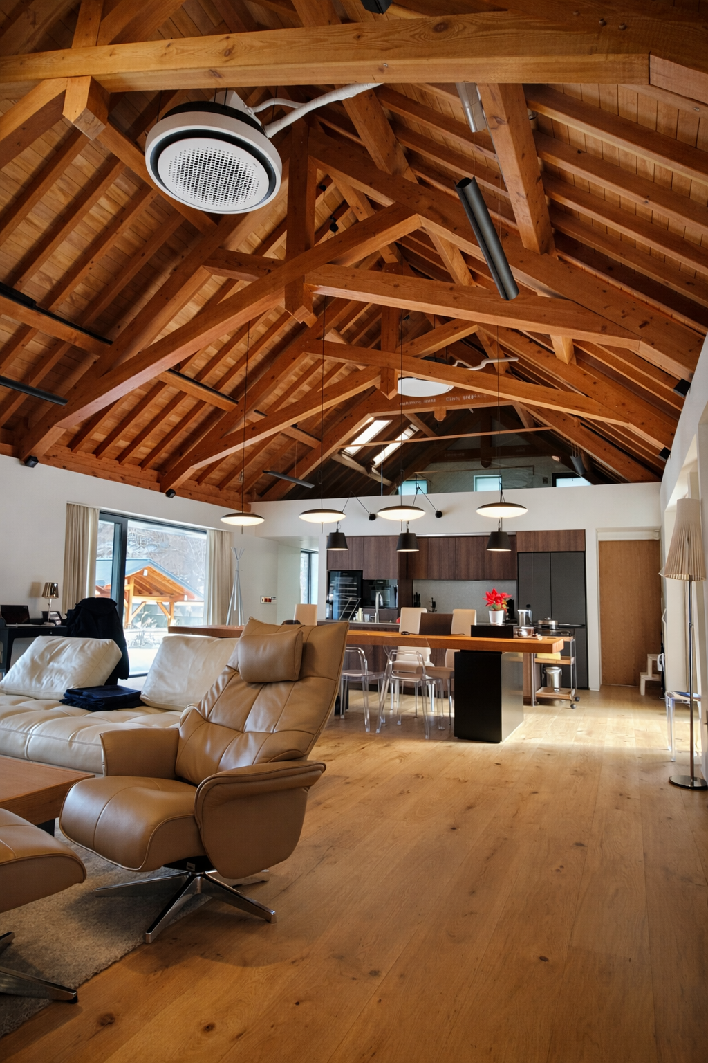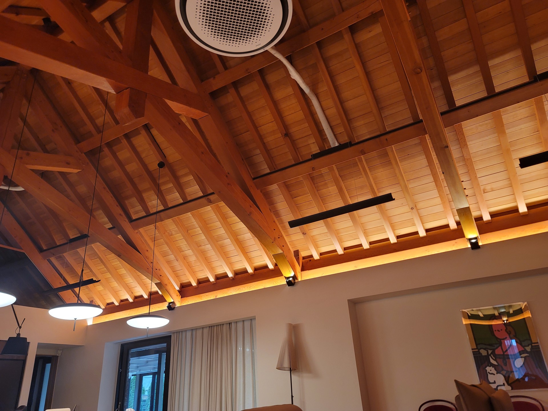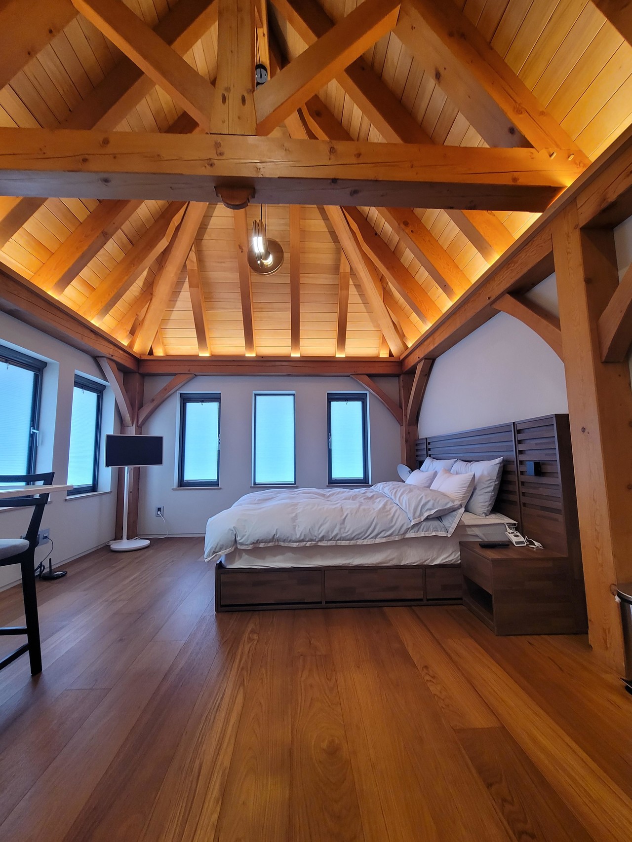 또 이번 프레임에서는 벤트와 펄린으로 천장마감을 끝내지 않고 펄린 위에 추가로 서까래를 두었다. 장점은 천장에 깊이와 두께를 만든다. 이렇게 만들어진 천장은 높은 천정고와 어울려 공간감을 만든다.