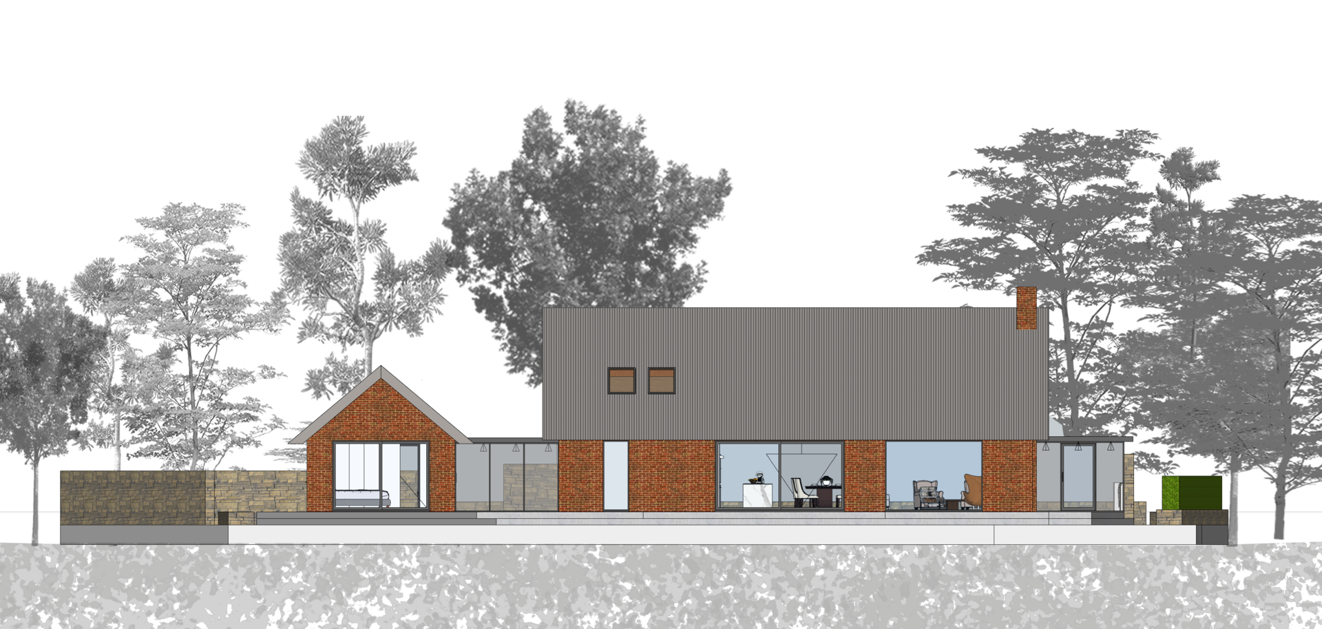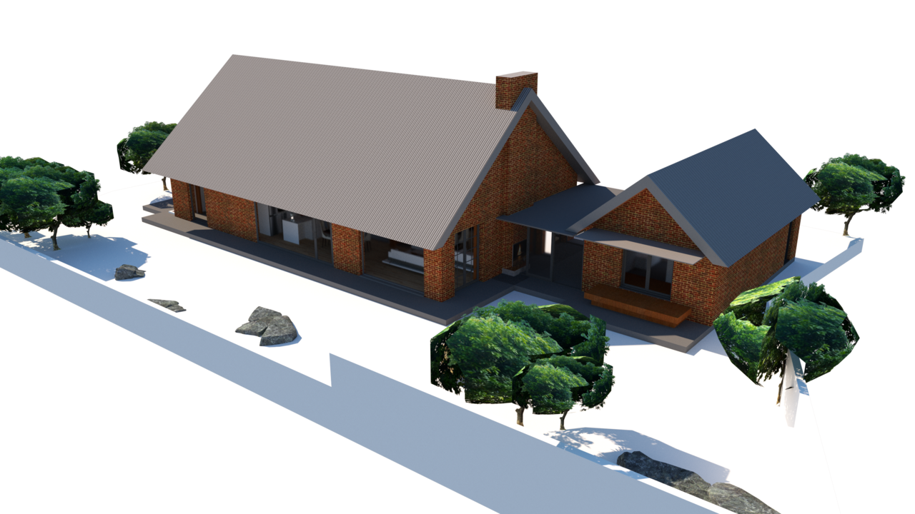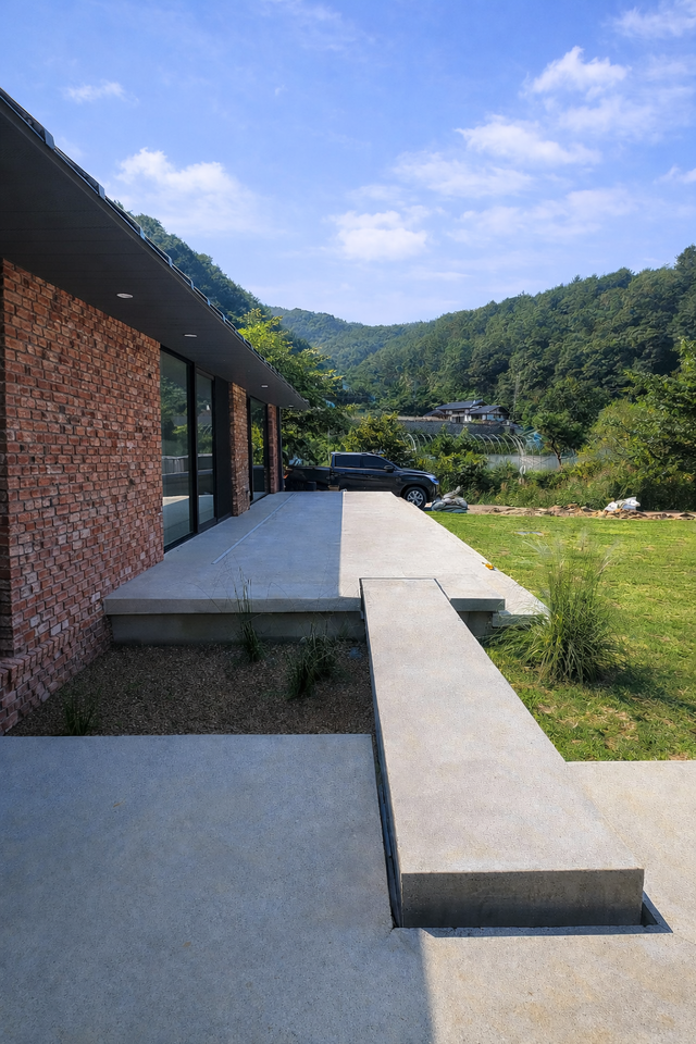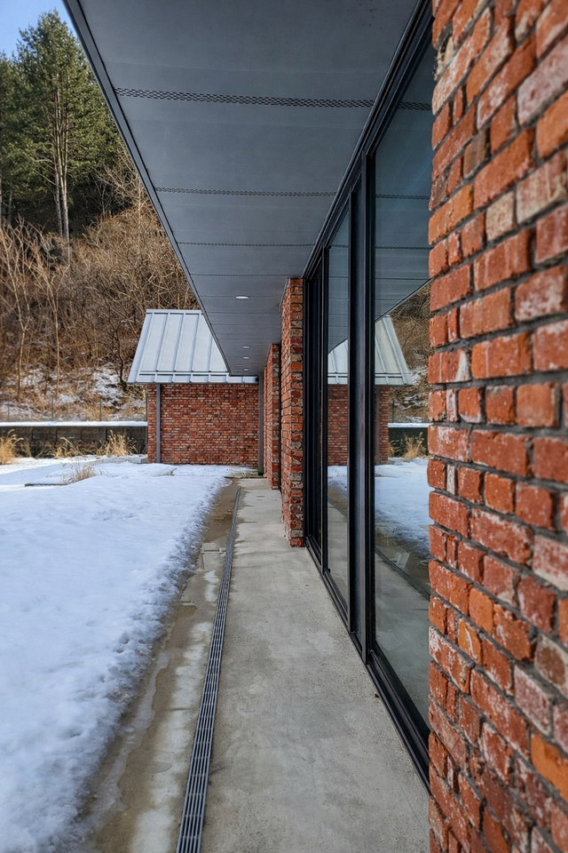 옛날 창고 건축에서 흔히 볼 수 있는 붉은 고벽돌로 외장을 마감했다. 고벽돌이 주는 묵직한 존재감은 시간이 흐를수록 더 깊이 있는 표정을 만들어낼 것이다. 그리고 그 위를 덮는 삼각형 지붕에는 티탄징크를 적용하였는데 세월이 지나며 자연스럽게 변색되는 금속면의 미묘한 변화도 이 집의 일부가 되게 하는 것이 의도이다. 이 집이 단순한 주거공간이 아니고 시간이 지나며 더 깊어지는, 그림 속 소품처럼 하나의 풍경으로 남길 바랐다.