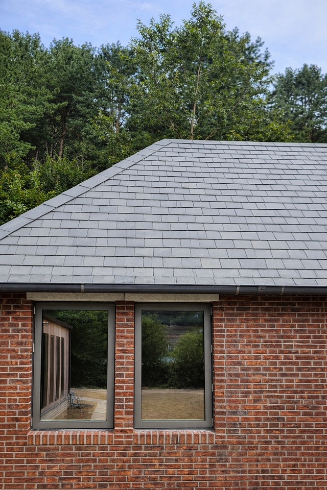 게스트하우스에는 천연 돌기와를 시공하였는 데. 천연 슬레이트 기와는 유럽에서 전통적으로 높은 지붕각의 지붕에 주로 적용하는 재료이다.