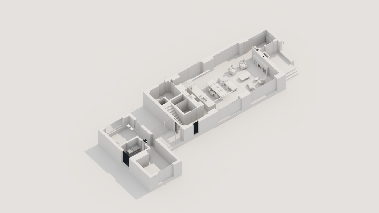 본동의 메인 박스에는 다이닝, 주방, 거실을 하나의 지붕 아래에 두고, 칸막이 없이 일렬로 배치해 개방적인 단일 공간으로 만들었다. 형태만 보면 농가의 창고를 연상시키는 단조로운 박공 구조이다.